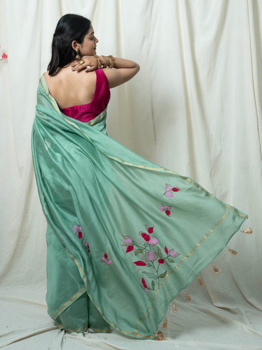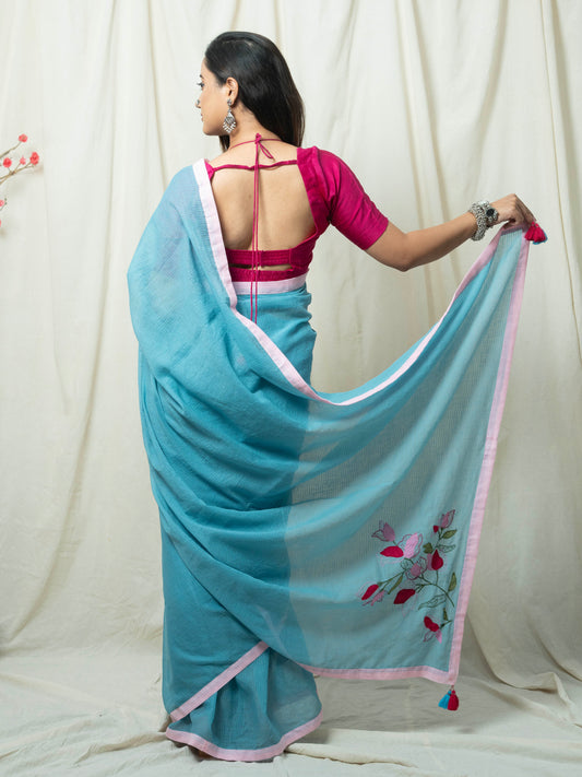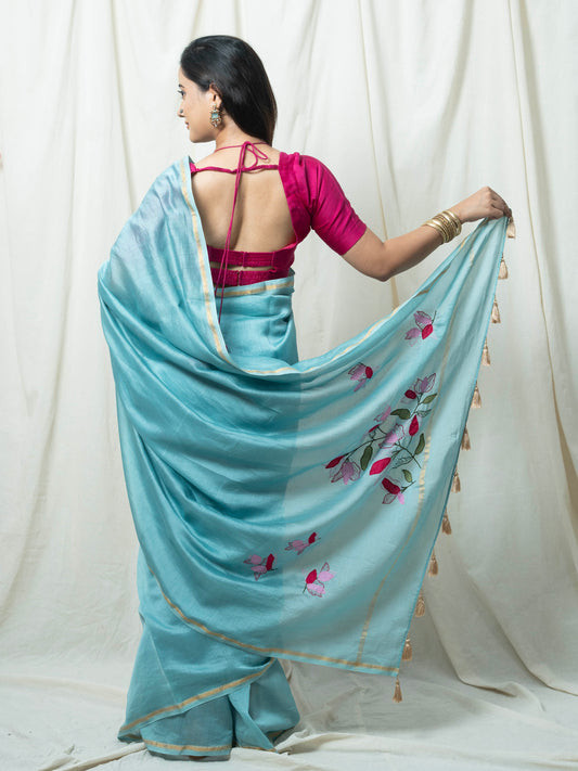 Expert hands delicately embroider each mirror, infusing the नीलिमा Saree with elegance and light.