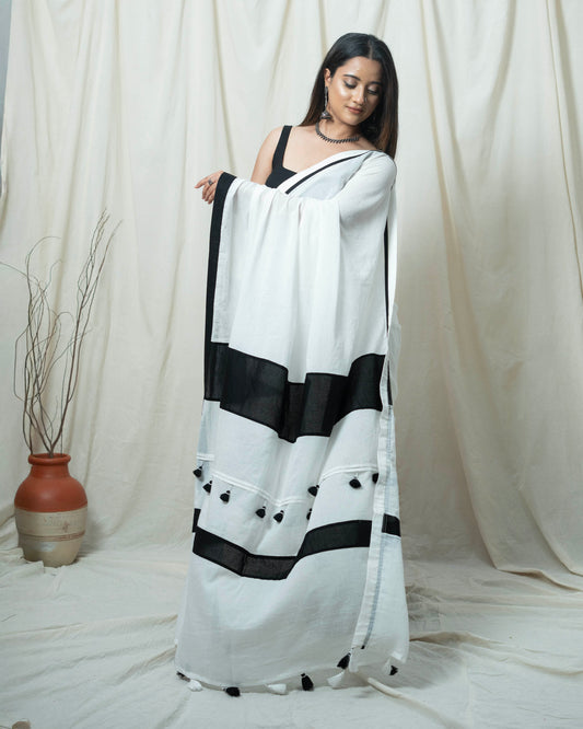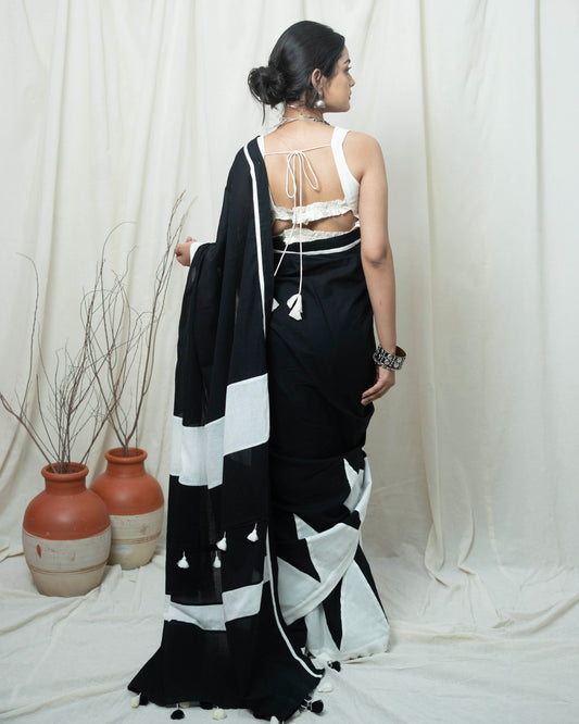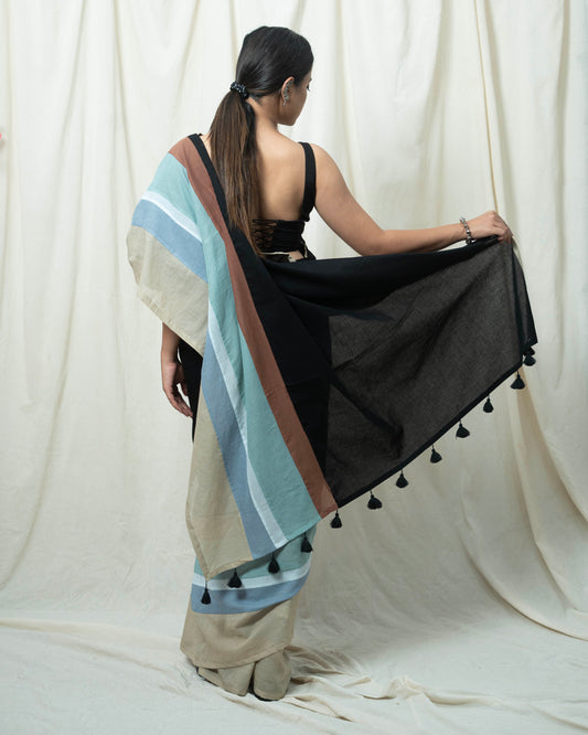 The saree is a chic beautiful blend of modern and ethnic look. Perfect for even office events. Especially the combination of black with all those vibrant colors looks stunning even from a mile. The whole fact that the idea of sustainability was kept in mind is the game changer.