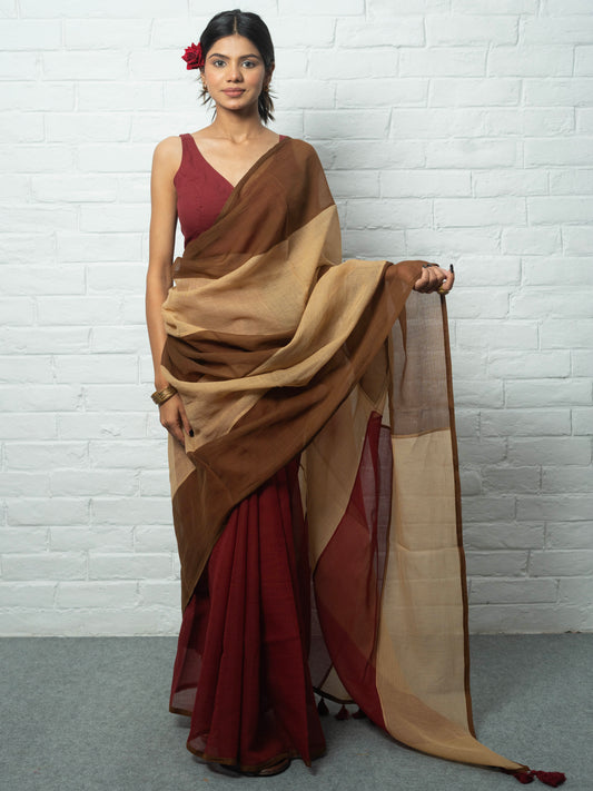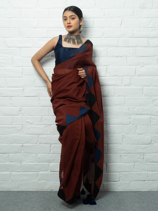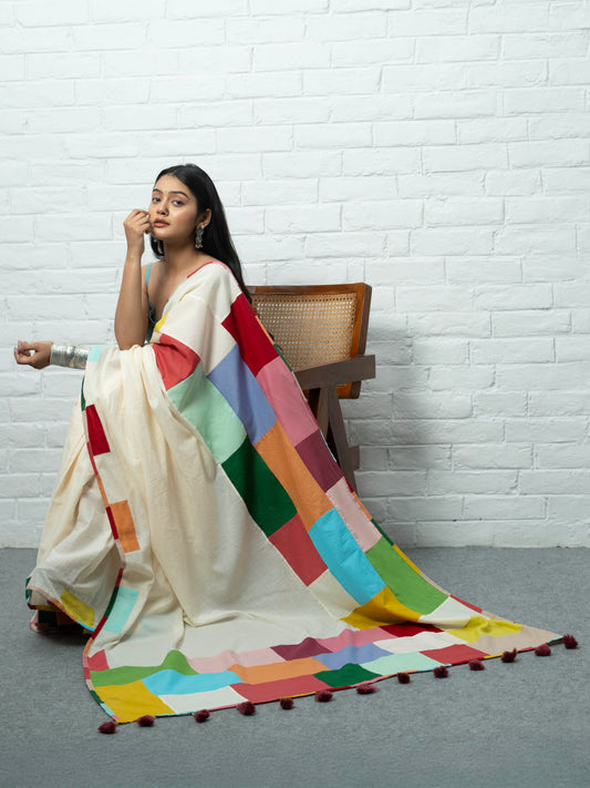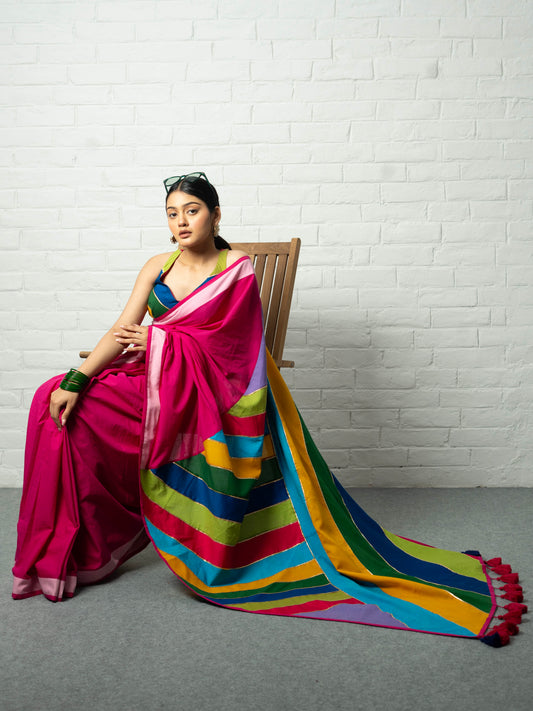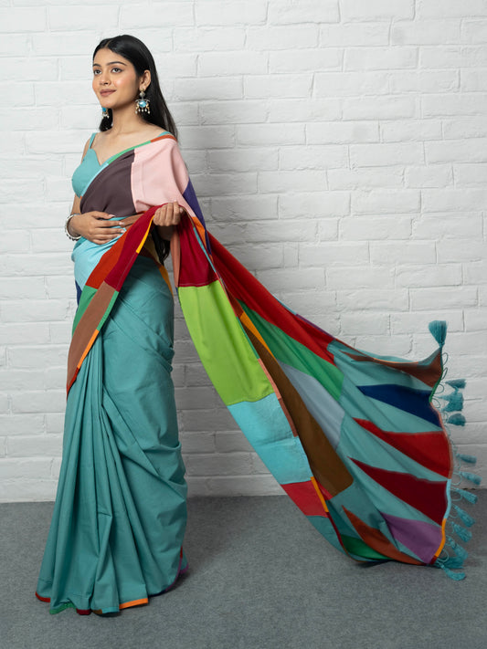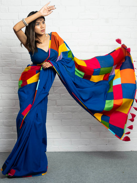 Pure cotton, simple, elegant, easy to carry and such vibrant colours. There's nothing to not like about this saree. And I love the fact that it's made our of katran (small unused pieces of clothing which would otherwise have gone to waste). Can match with any contrast blouse and wear on different occasions