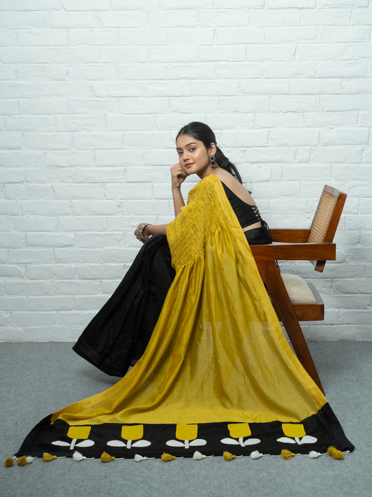The saree is a chic beautiful blend of modern and ethnic look. Perfect for even office events. Especially the combination of black with all those vibrant colors looks stunning even from a mile. The whole fact that the idea of sustainability was kept in mind is the game changer.