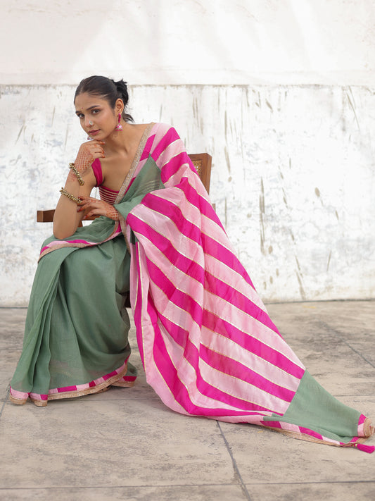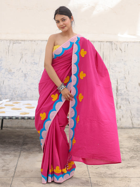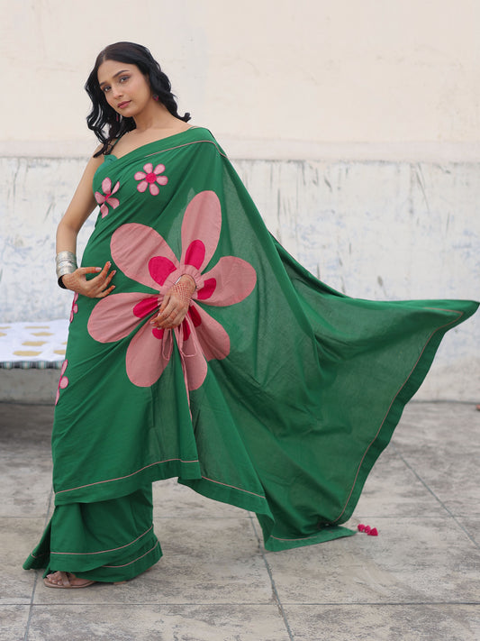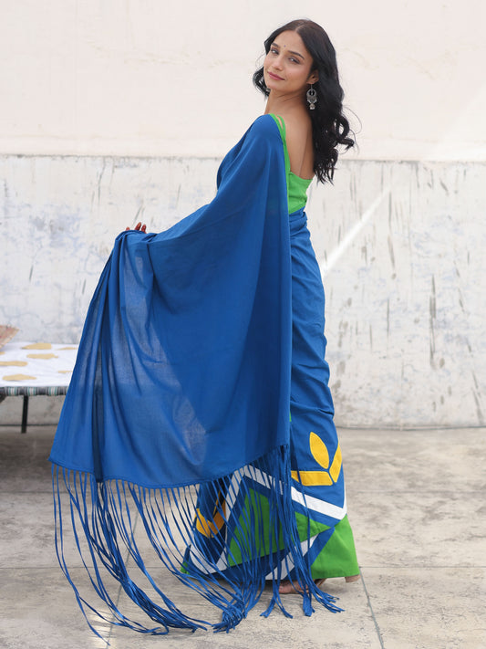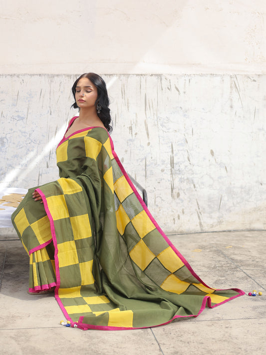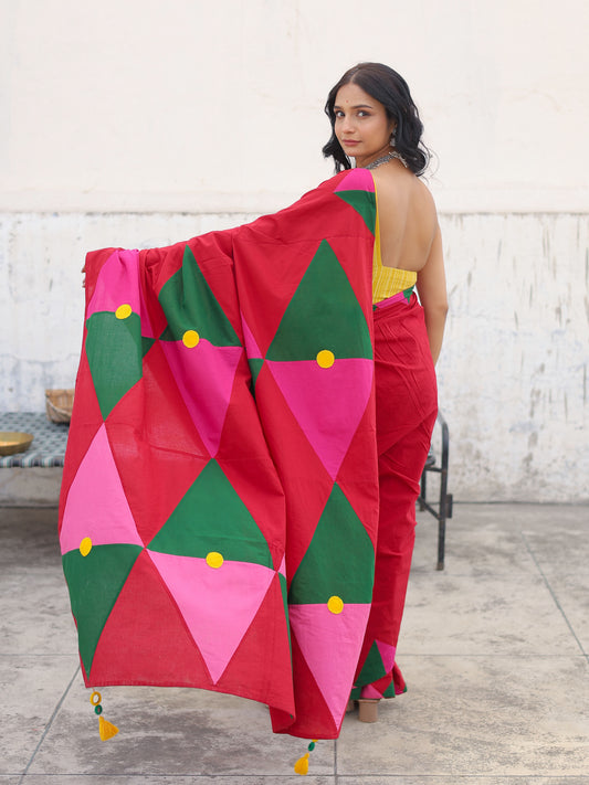Pure cotton, simple, elegant, easy to carry and such vibrant colours. There's nothing to not like about this saree. And I love the fact that it's made our of katran (small unused pieces of clothing which would otherwise have gone to waste). Can match with any contrast blouse and wear on different occasions