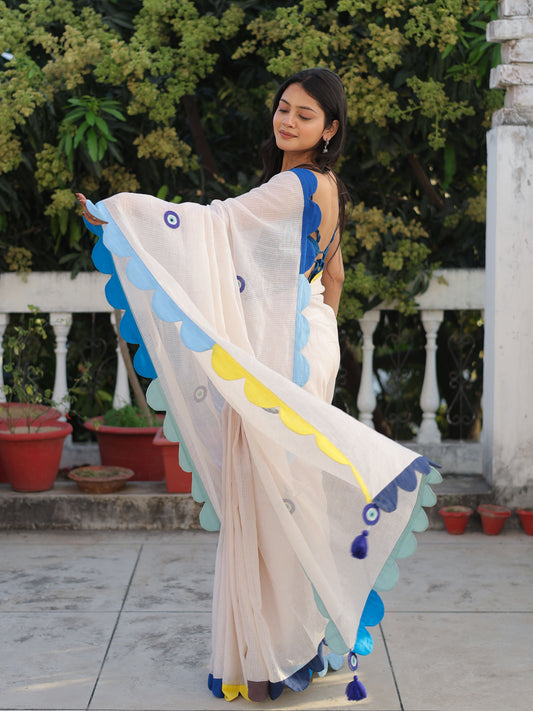 Expert hands delicately embroider each mirror, infusing the नीलिमा Saree with elegance and light.
