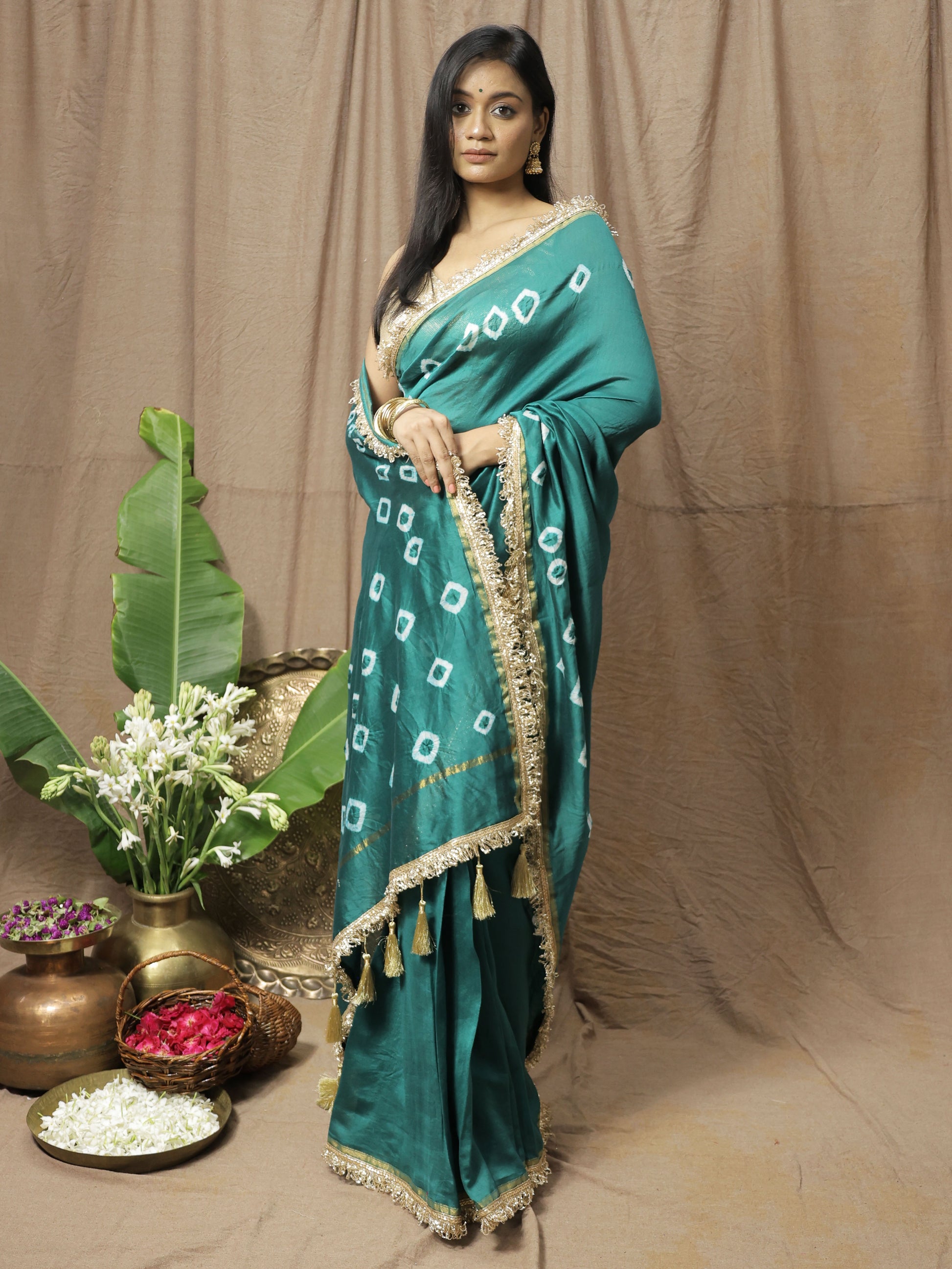 Unleash your inner rebel with the Tejasvini Saree. This bottle green chanderi silk bandhani masterpiece, handcrafted by Save As, defies convention. Its rich hue meets the audacious gleam of gold Kiran lace and playful zari tassels, creating a bold statement with a whisper of romance. Perfect for the modern woman who embraces unique traditions.