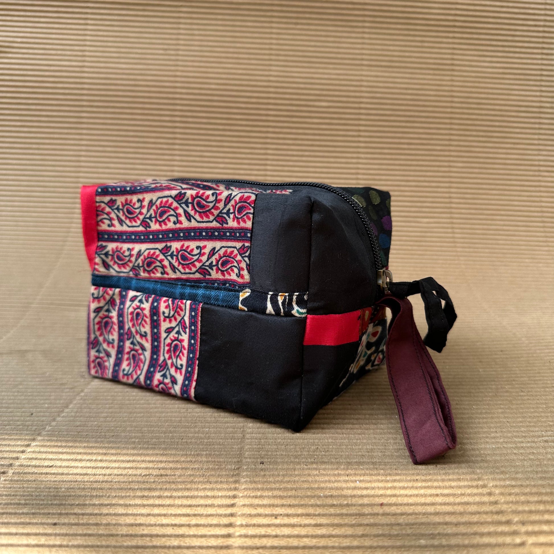 Pouch made out of waste fabric pieces left out in the manufacturing process.
