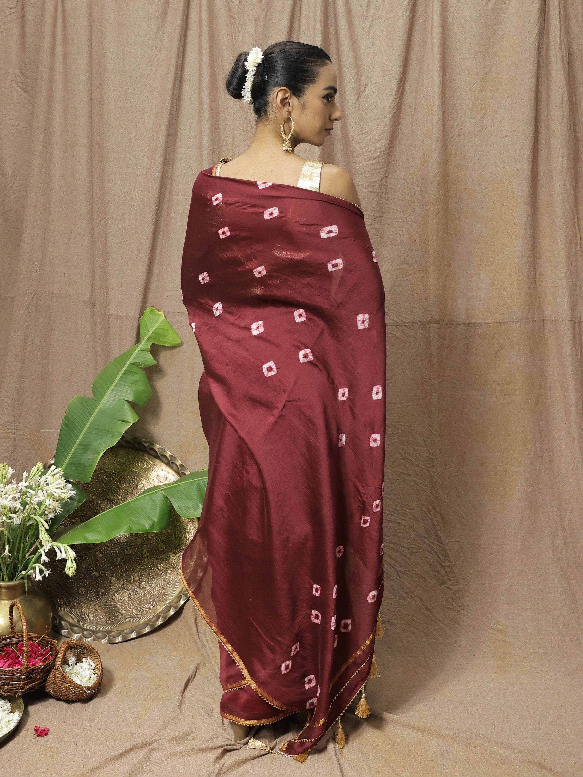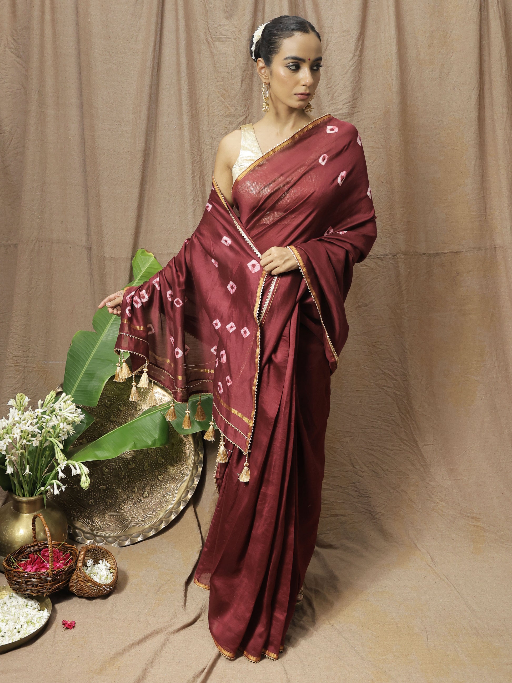 Unleash your inner rebel. The Bulbul Saree is a bold statement, handcrafted from maroon chanderi silk bandhani. Gold gota lace weaves a striking contrast, while delicate silk thread tassels, adorned with gold beads, add a touch of untamed romance. Own your unique style, unapologetically.