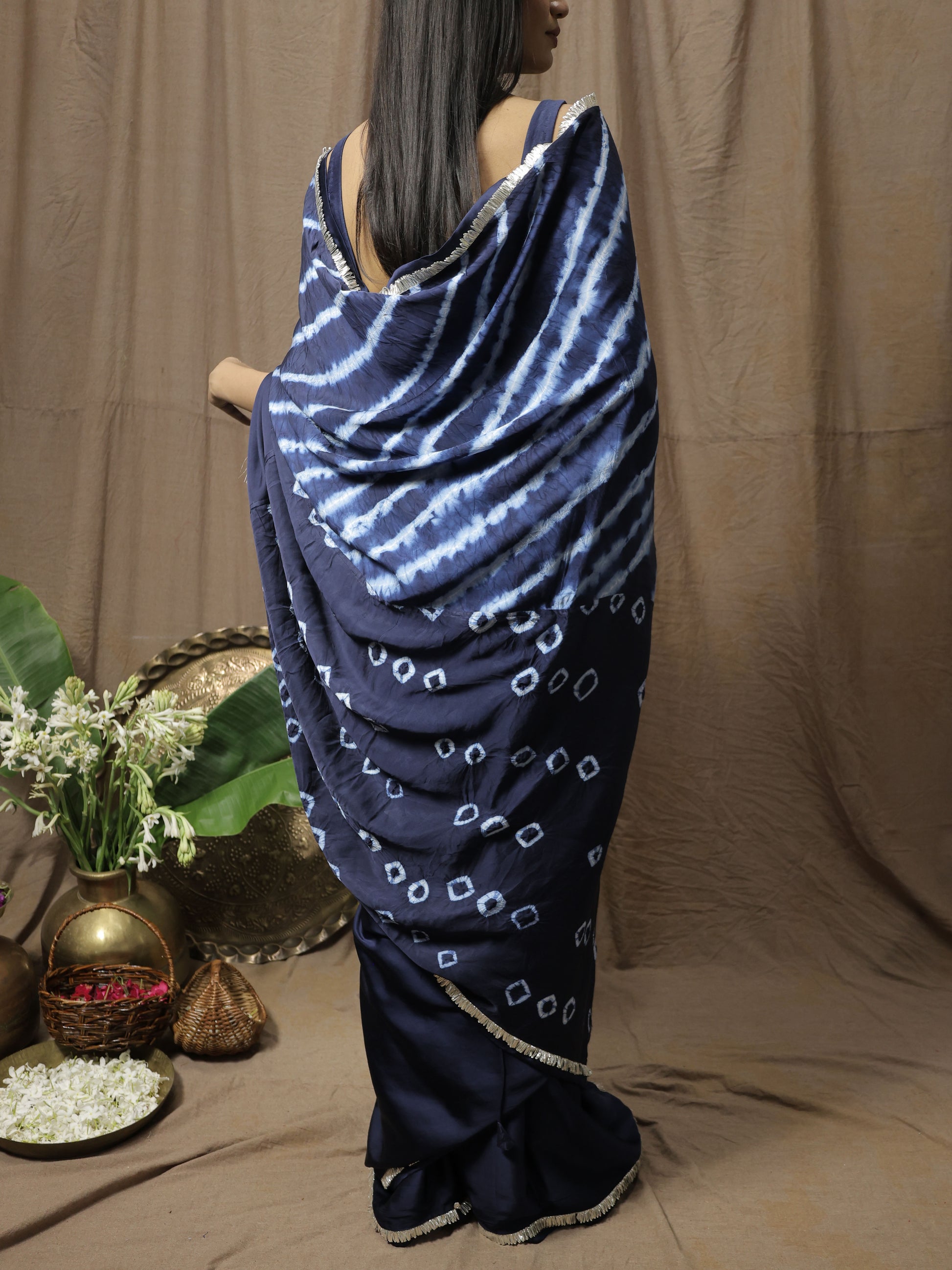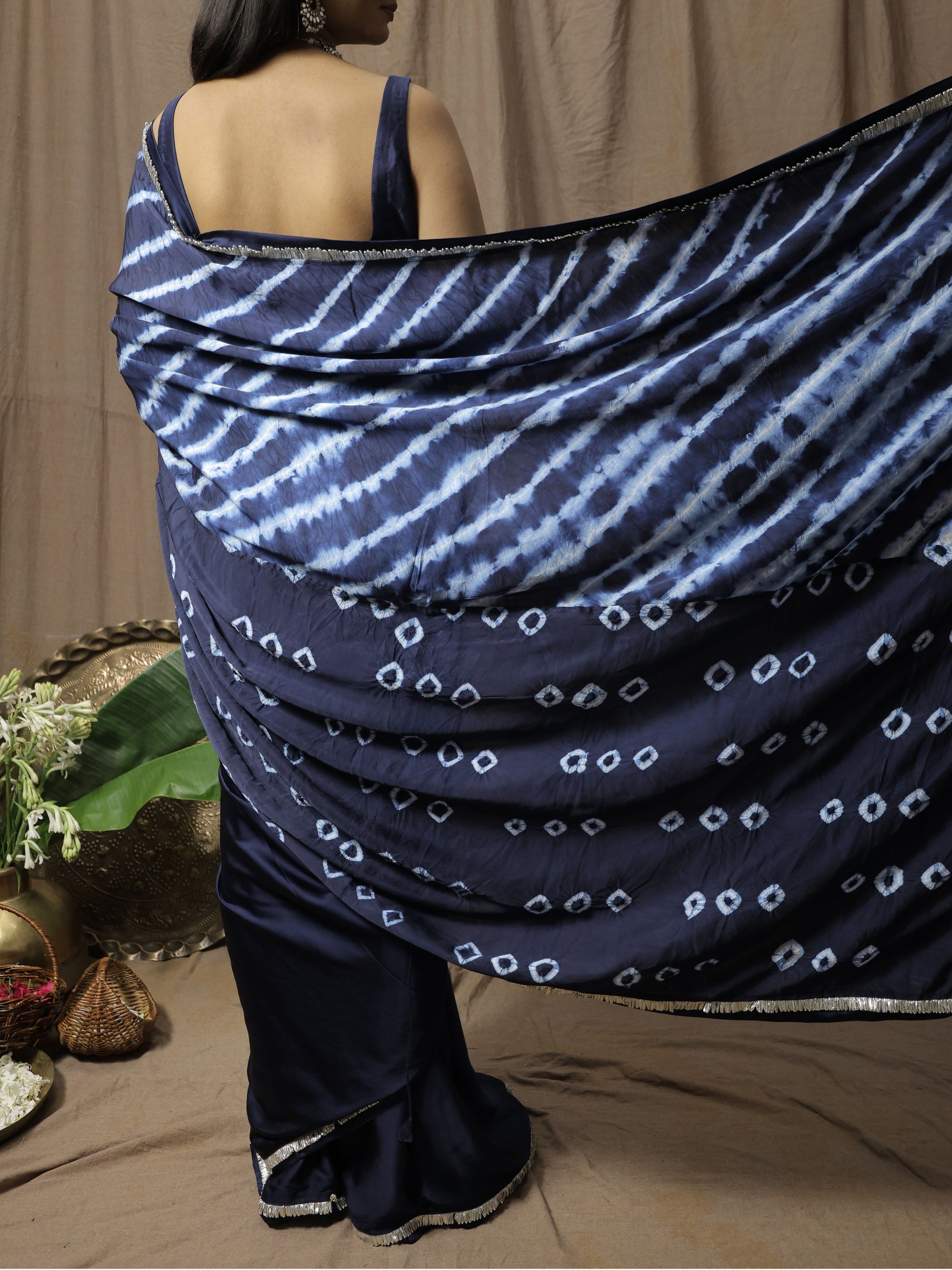 Unleash your daring spirit. The Karishma Saree, a Prussian blue modal satin dream, blends rebellious bandhani and shibori on its palla. Gota lace and zari tassels add a romantic edge, ensuring you command attention with every graceful drape. Own your unique story.