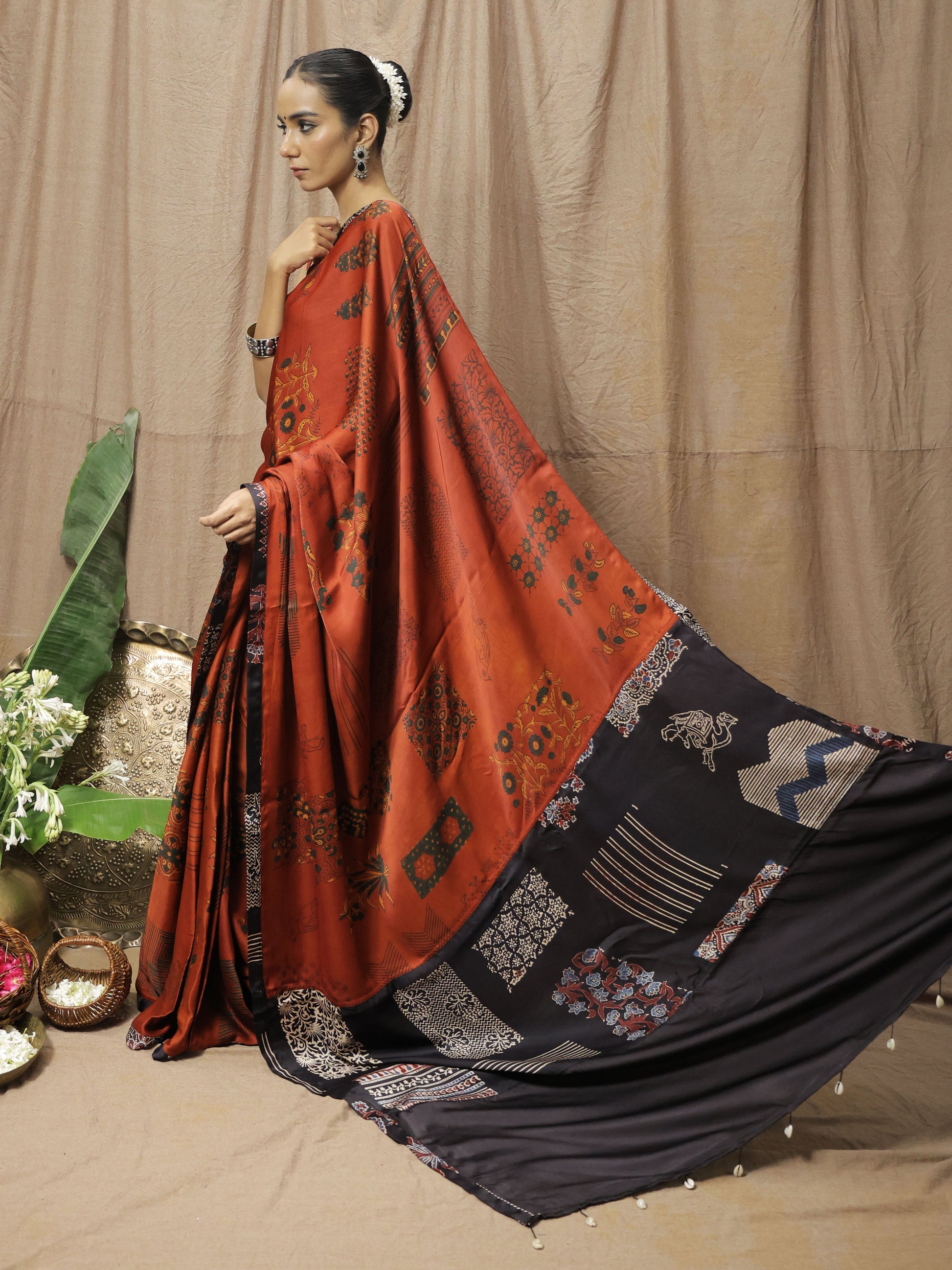 Defy convention in the Kavya Saree. Crafted from luxurious Modal Satin, its vibrant rust base is intricately adorned with an overall Ajrakh print. Bold black Ajrakh accents and a solid section add striking depth, while the detailed border completes a look that's both rebellious and romantically unique. Handcrafted for the modern icon.