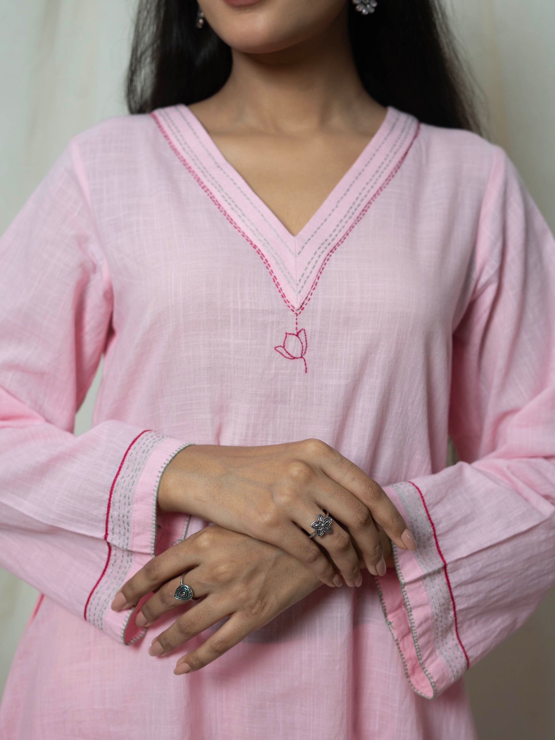 Unleash your inner rebel with the Sunaina Kurta Set. Crafted from pink Cotton Slub, this set features a daring V-neck and an asymmetrical hem that defies convention. Hand-embroidered kantha in sage green and fuchsia pink adds an exquisite, romantic edge. A modern statement from Save As, designed for the woman who writes her own rules.